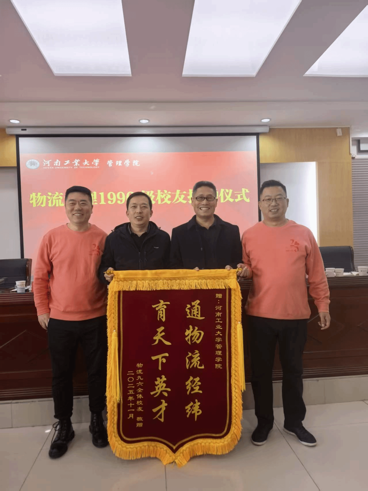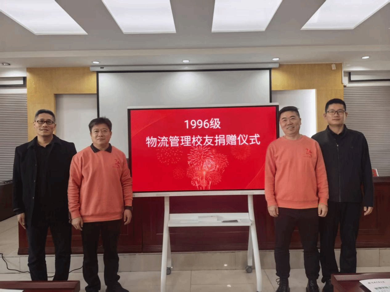 党委书记李国仓与院长李凤廷共同接收。这份捐赠不仅是物质上的支持,更承载着1996级校友对母校与专业的深情厚谊,是薪火相传的精神象征。随后,全体参会人员合影留念,镜头定格下这一温情而有意义的瞬间。