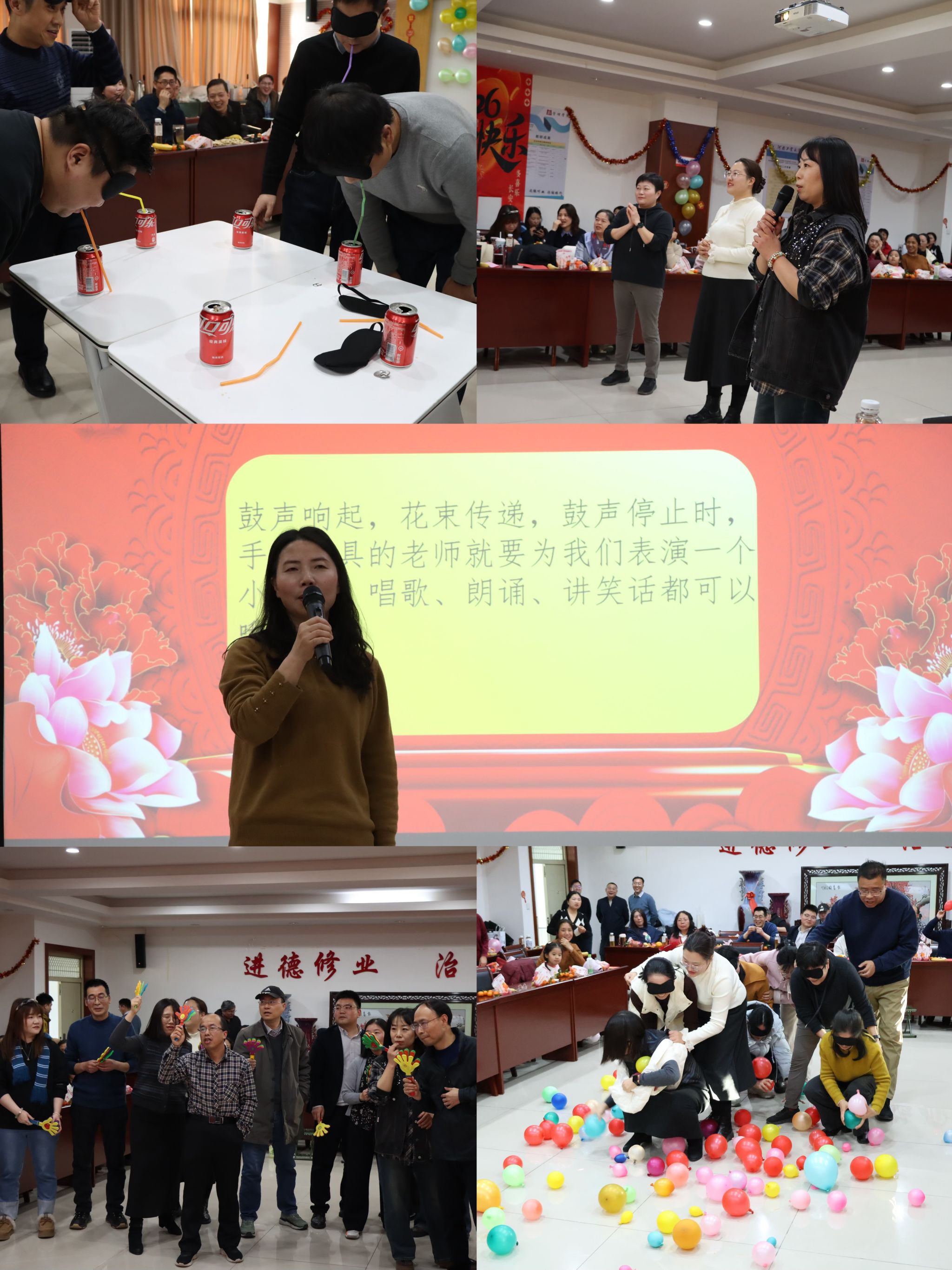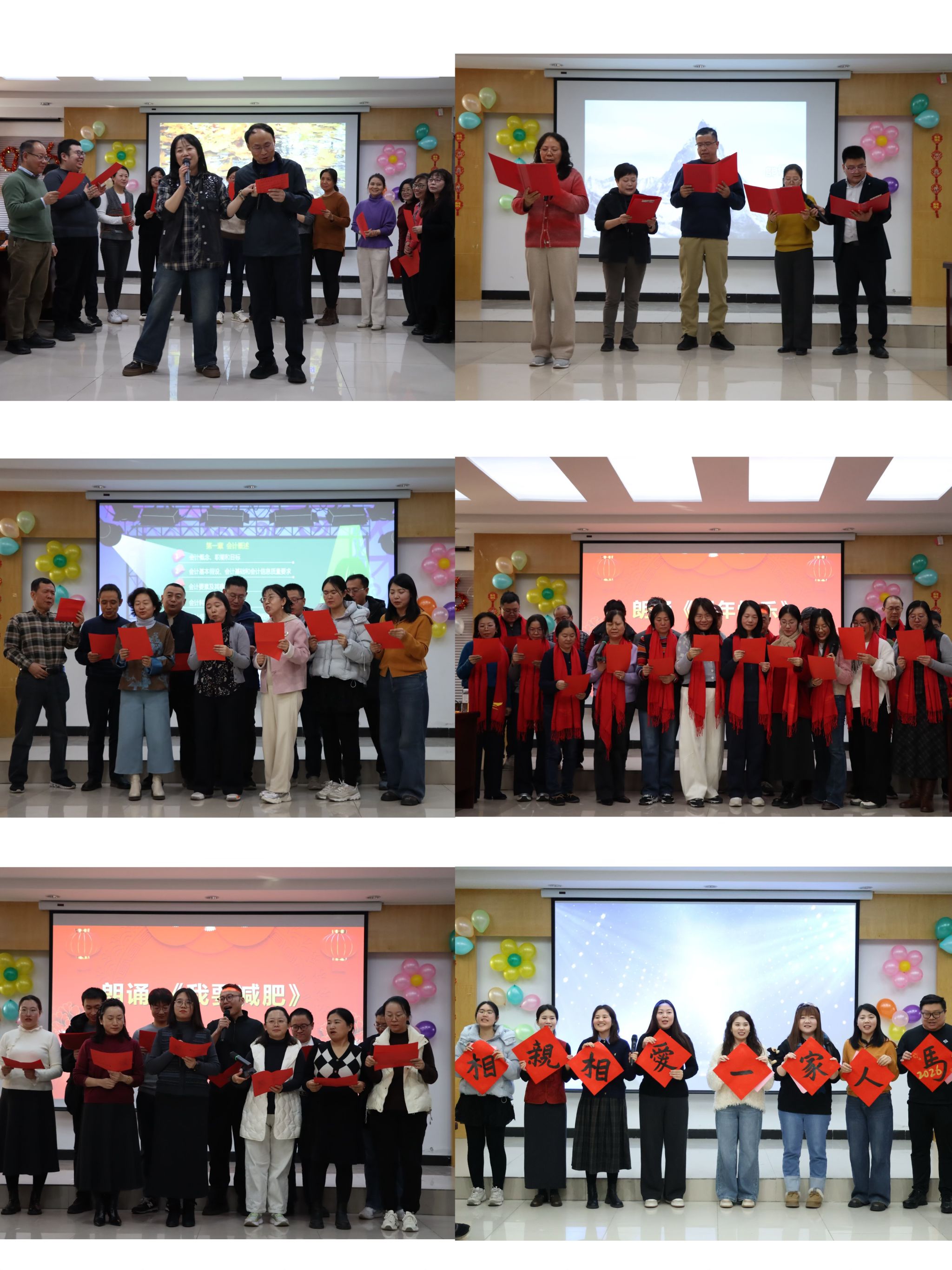 本次联欢会内容丰富、精彩纷呈,精心设置了节目表演、趣味游戏、幸运抽奖等多个互动环节。联欢会伊始,工商系老师登台演唱经典歌曲《水中花》,悠扬旋律婉转缠绵,瞬间点燃现场氛围。随后,市场营销系的朗诵《我的南方和北方》字里行间饱含家国情怀,带领大家领略山河之美;会计系的《会计之歌》唱出了专业初心与责任担当;物流系带来诗朗诵《新年快乐》传递着新年暖意;电子商务系的《我要减肥》创意十足、妙趣横生,赢得台下阵阵热烈掌声;行政人员带来合唱《爱+相亲相爱一家人》更是解锁“歌手”新身份,展现了别样风采;最后院领导集体登台表达真挚感谢之情,送上温馨祝福之意。