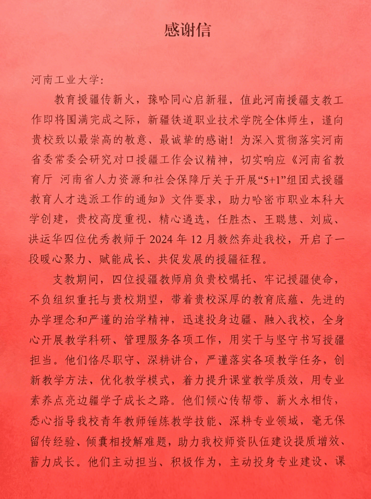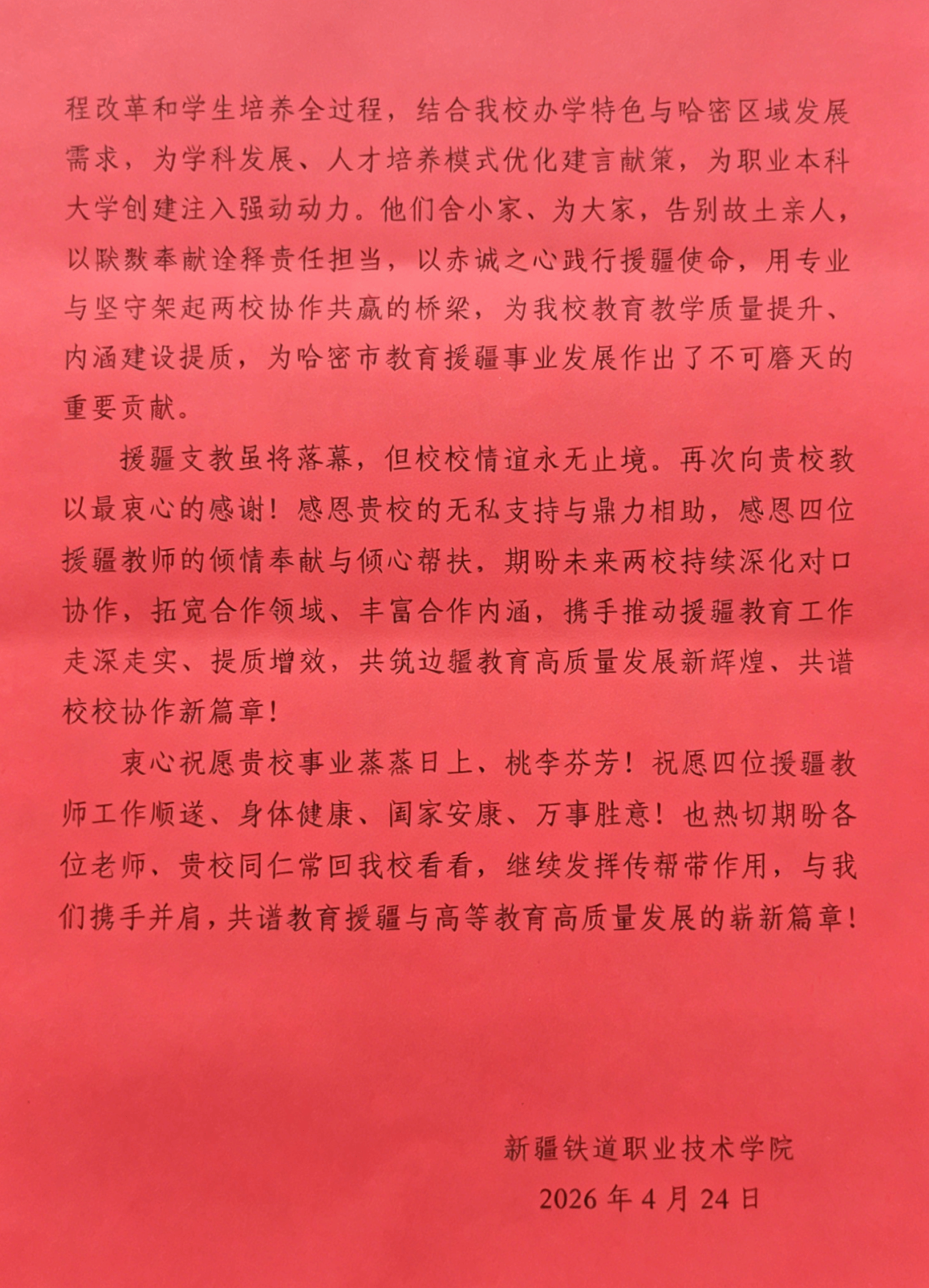 专门致信我校,对四名援疆教师的突出表现和我校的大力支持表示衷心感谢。下一步,我校将继续深入落实国家对口援疆战略,不断深化与受援学校的交流合作,持续提升教育援疆工作质效,为推动边疆职业教育高质量发展贡献更大力量。