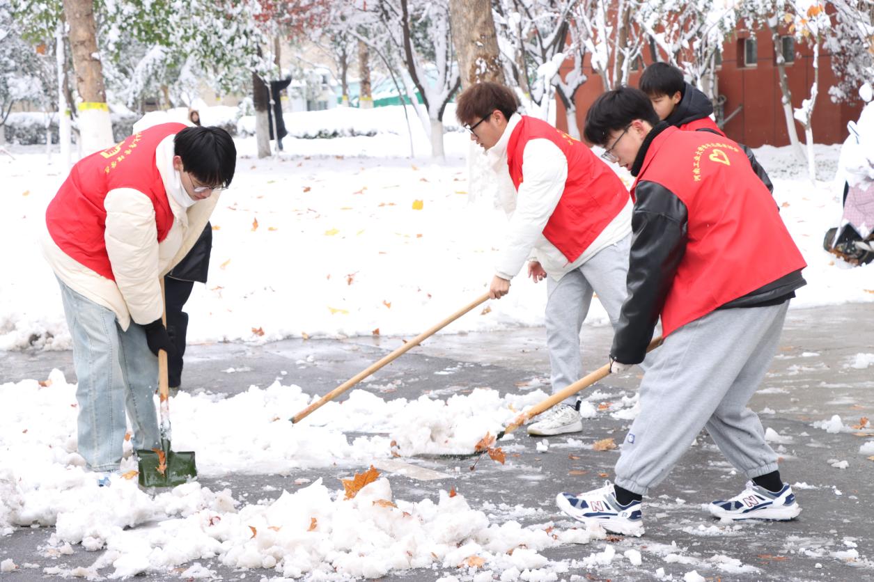面对冰与雪的考验,行动是最好的融雪剂。为了提高清扫效率,大家团结协作、不畏严寒,利用铁铲、扫帚等工具,对3号楼附近的主干路、楼宇间过道和台阶的积雪进行清扫和防滑处理,为师生开辟出一条条安全通行的道路。