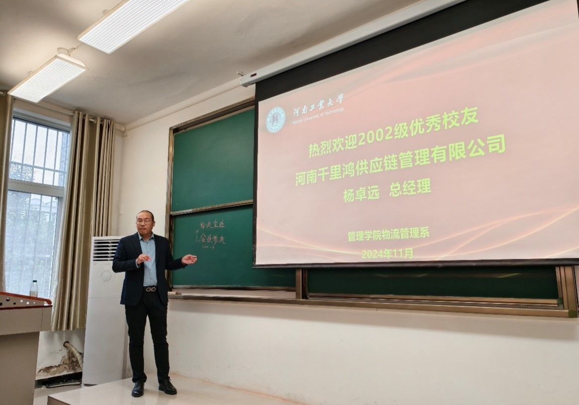 物流管理系举办“优秀毕业生进课堂”系列活动,邀请了2002级优秀毕业生代表、河南千里鸿供应链管理有限公司、河南千里鸿文化传媒有限公司总经理杨卓远,为2024级物流管理、供应链管理2个专业学生分享大学生活规划、成长经历和创业经验。