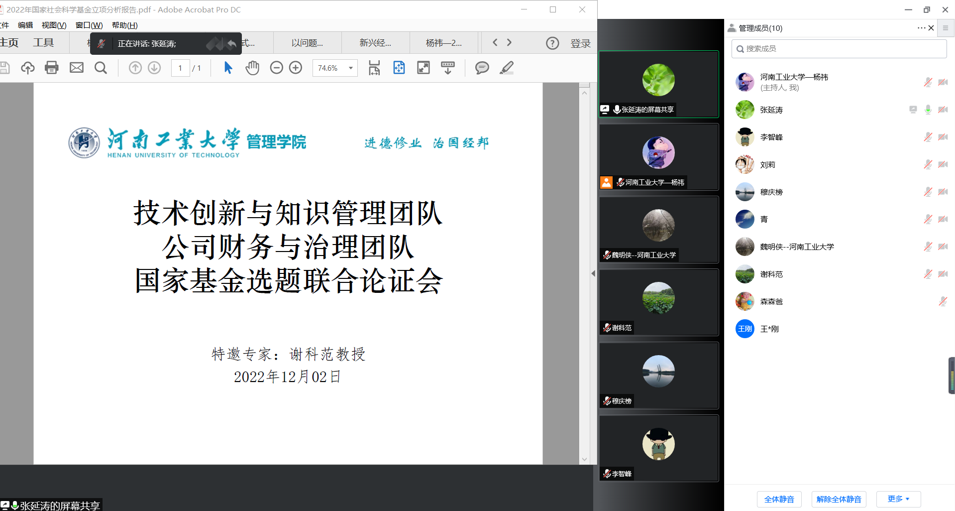 谢科范教授细致入微的点评让参会教师受益匪浅。最后,杨艳萍做总结,她指出各位教师应根据谢老师的建议抓紧时间进行修改和完善,并提醒团队成员,选题论证将告一段落,下一阶段将正式进入至申请书的撰写环节。