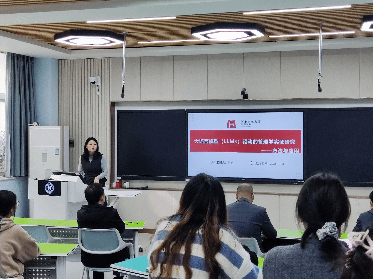 会计系谢楠博士作了题为“大语言模型驱动的管理学实证研究—方法与应用”的专题报告。报告聚焦如何利用大语言模型对海量非结构化文本数据进行深度分析。她以公司治理与资本市场研究为例,系统展示了如何运用基于BERT的文本分类模型挖掘投资者互动文本中的管理洞见,为师生提供了前沿的研究视角与方法指导。