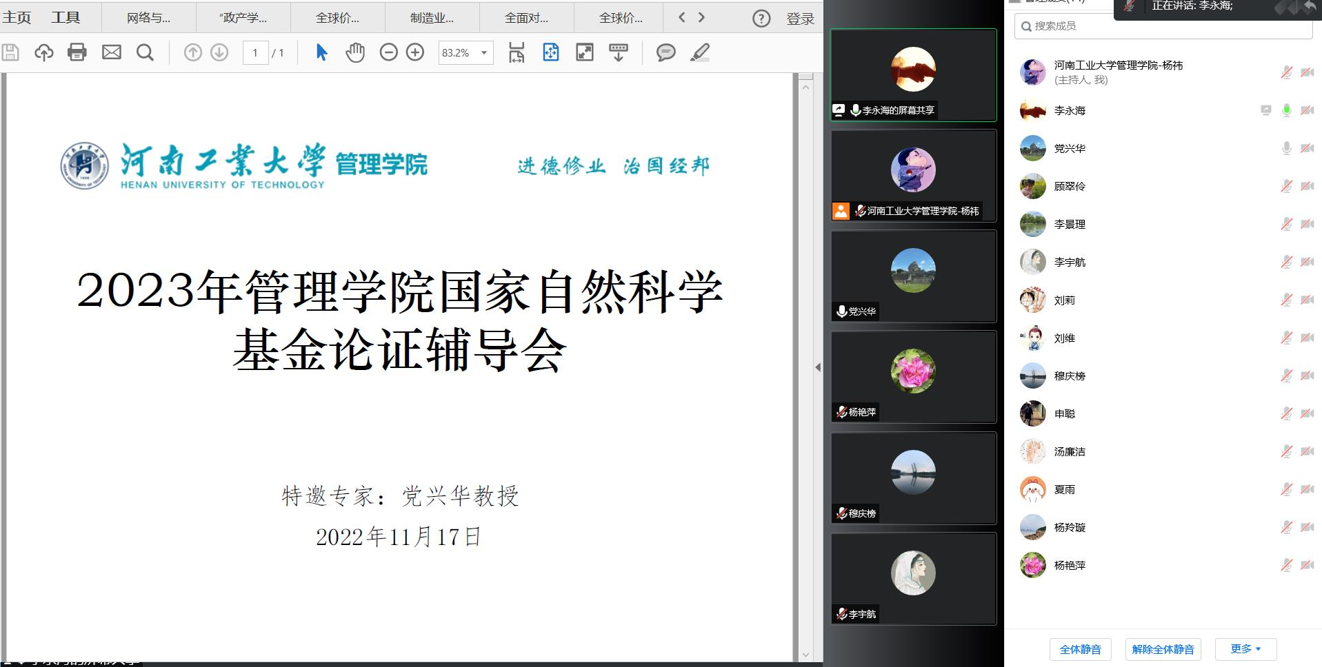 会议共分为两个阶段。首先由参与申报2022年国家自然科学基金的李永海、顾翠玲、李宇航、杨祎四位教师,结合去年的选题申报书与评审专家意见进行经验总结,党兴华教授围绕四个项目的选题背景与意义、科学问题的凝练、文献综述的撰写、研究内容的布局以及研究方案的设计,展开了细致入微的点评。随后准备申报2023年国家自然科学基金申报的汤廉洁、刘莉、申聪、刘维、李景理、夏雨六位教师,次序汇报各自的选题来源与拟定的框架内容,党兴华教授就各选题的题目设计、研究逻辑以及内容方案作出详细指导。