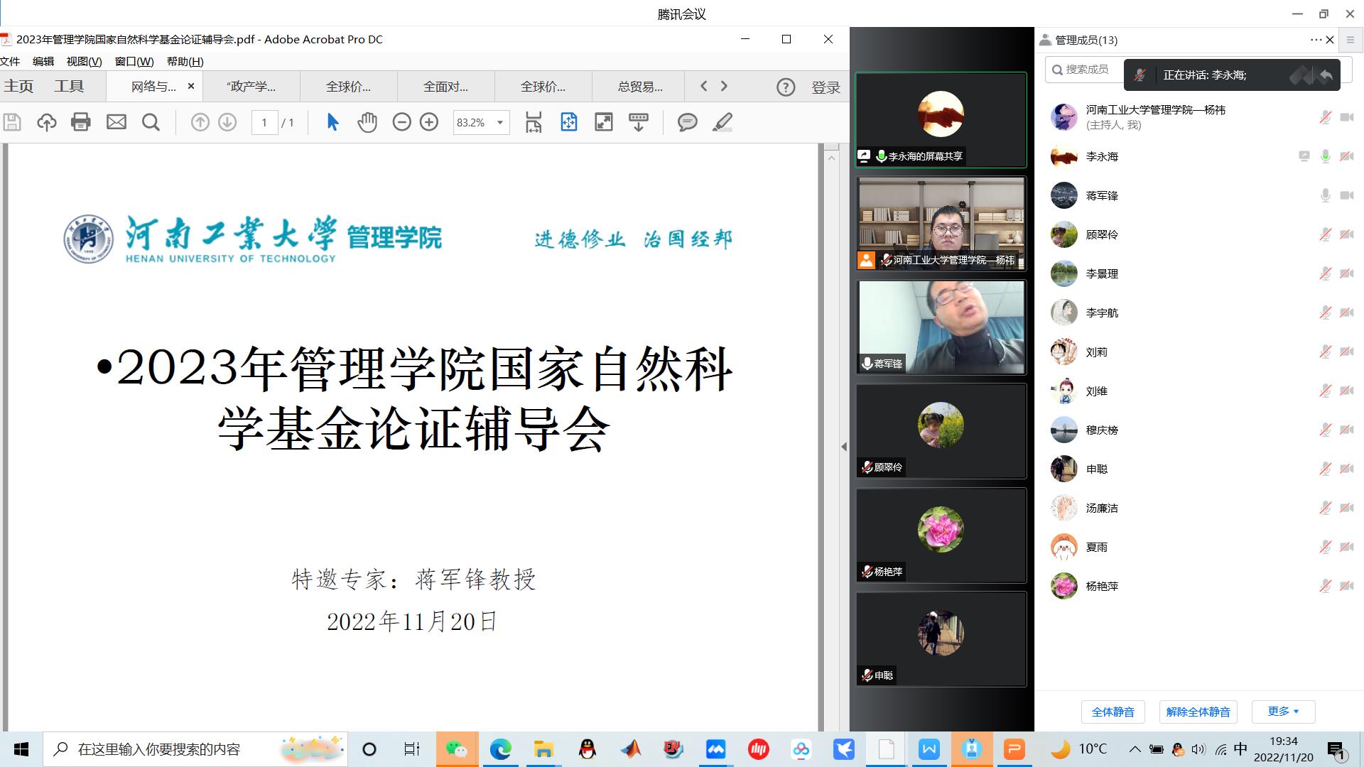 本次会议首先由参与申报2022年国家自然科学基金的李永海、顾翠玲、李宇航、杨祎四位教师,针对蒋军锋教授前期给予的反馈意见进行回答,蒋军锋教授重点点评了四个项目在科学问题凝练方面存在的问题,并指出详细的修改思路。随后汤廉洁、刘莉、申聪、刘维、李景理、夏雨六位教师,依次汇报了2023年国家自然科学基金的选题来源与拟定的框架内容,蒋军锋教授就六位老师的题目选择、内容设计作出详细指导。