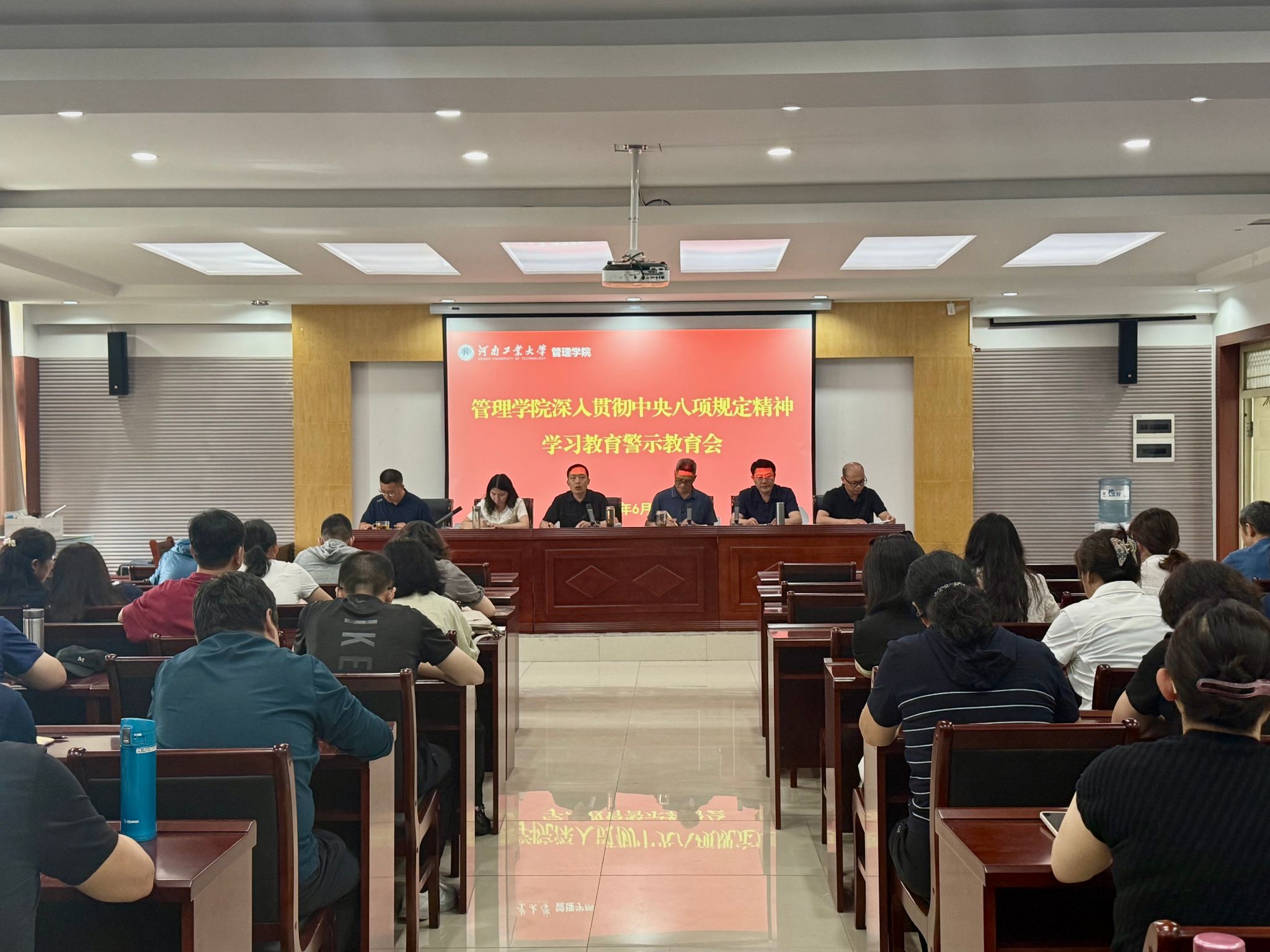 会上传达了中共河南工业大学委员会深入贯彻中央八项规定精神学习教育工作专班新下发的系列文件精神,并选取了深入贯彻中央八项规定精神学习教育警示教育学习资料中3个不同场景的典型警示教育案例和信阳市、罗山县10名干部在学习教育期间违规吃喝的反面典型案例进行深入剖析,深刻揭示了违规违纪所带来的严重后果,为教职工敲响了廉洁自律的警钟。