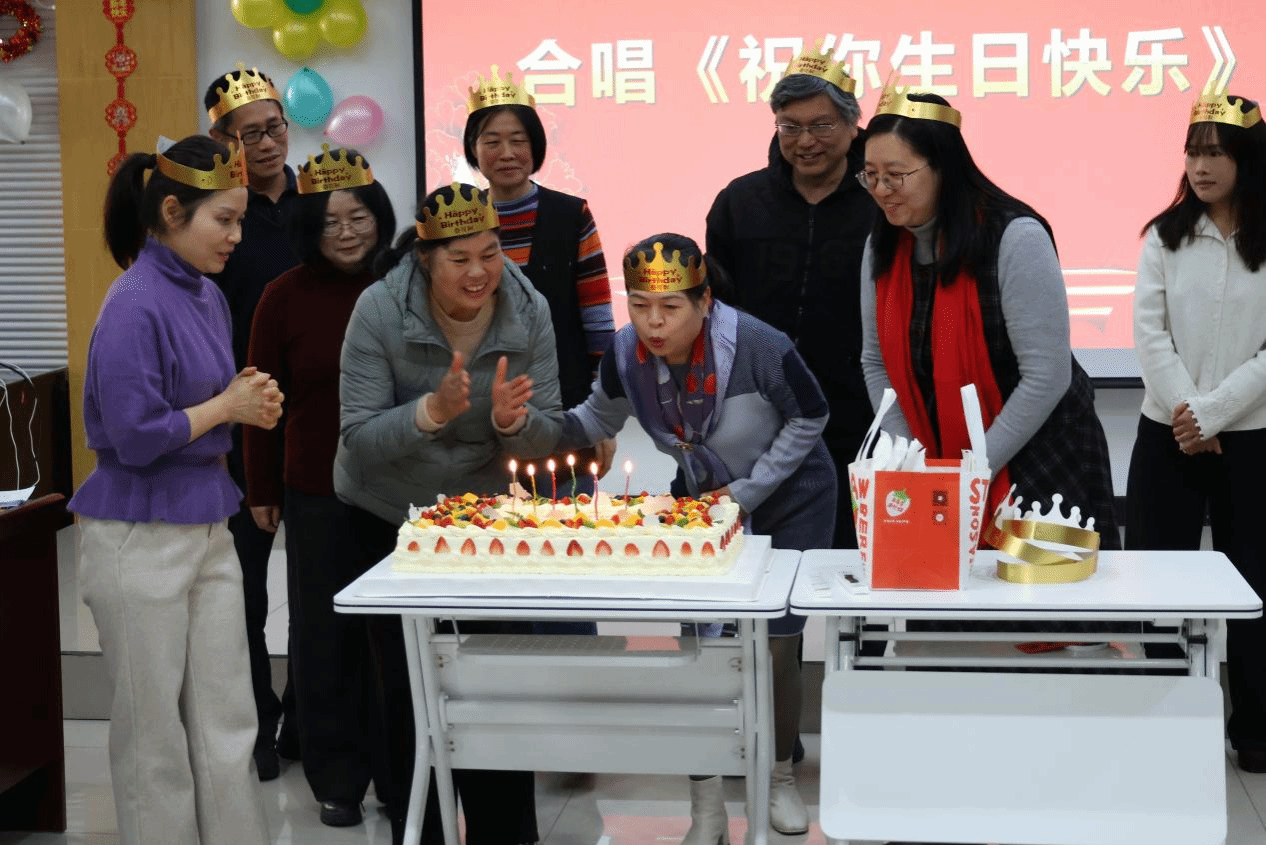 领导为寿星们佩戴生日帽、合影留念。烛光摇曳中,全场齐唱生日歌,寿星们许下美好心愿、吹灭蜡烛。工会委员与工会小组长有序分切、传递蛋糕,香甜滋味交织着真挚情谊,定格下温馨瞬间。