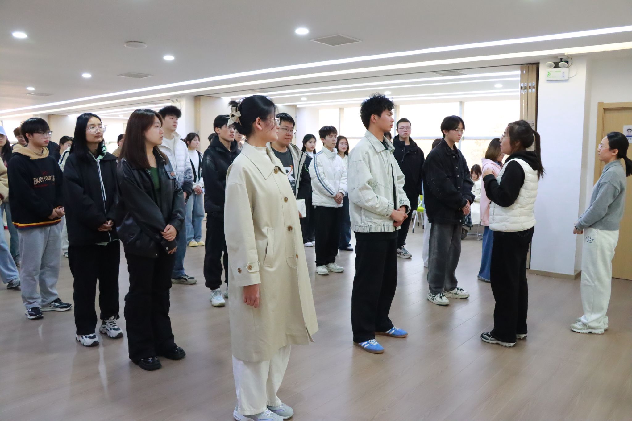 活动伊始,张佳晨组织同学们通过肢体语言生动演绎“天气预报”,大家用丰富的动作分别表现晴天、雨天和暴雨等不同天气状态。在欢声笑语中,同学们逐渐打破了初识的拘谨,现场气氛轻松而融洽。在随后的“滚雪球”环节中,同学们依次复述前一位同学的自我介绍并补充自己的信息,如同滚雪球一般,信息链条越来越长,形成了妙趣横生的“滚雪球”效应。这一环节不仅点燃了现场的热烈气氛,更让同学们在欢声笑语中迅速拉近了彼此的距离。