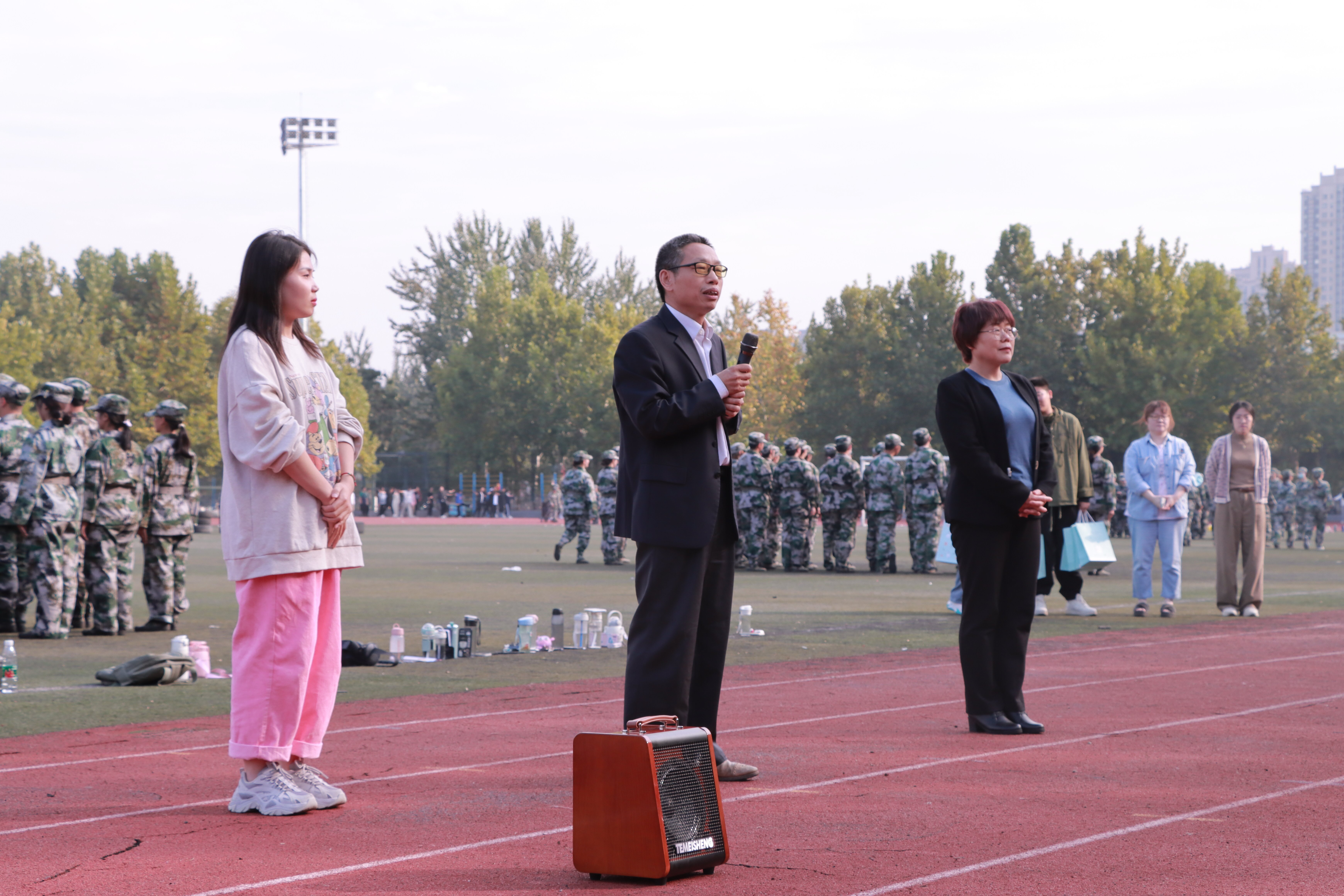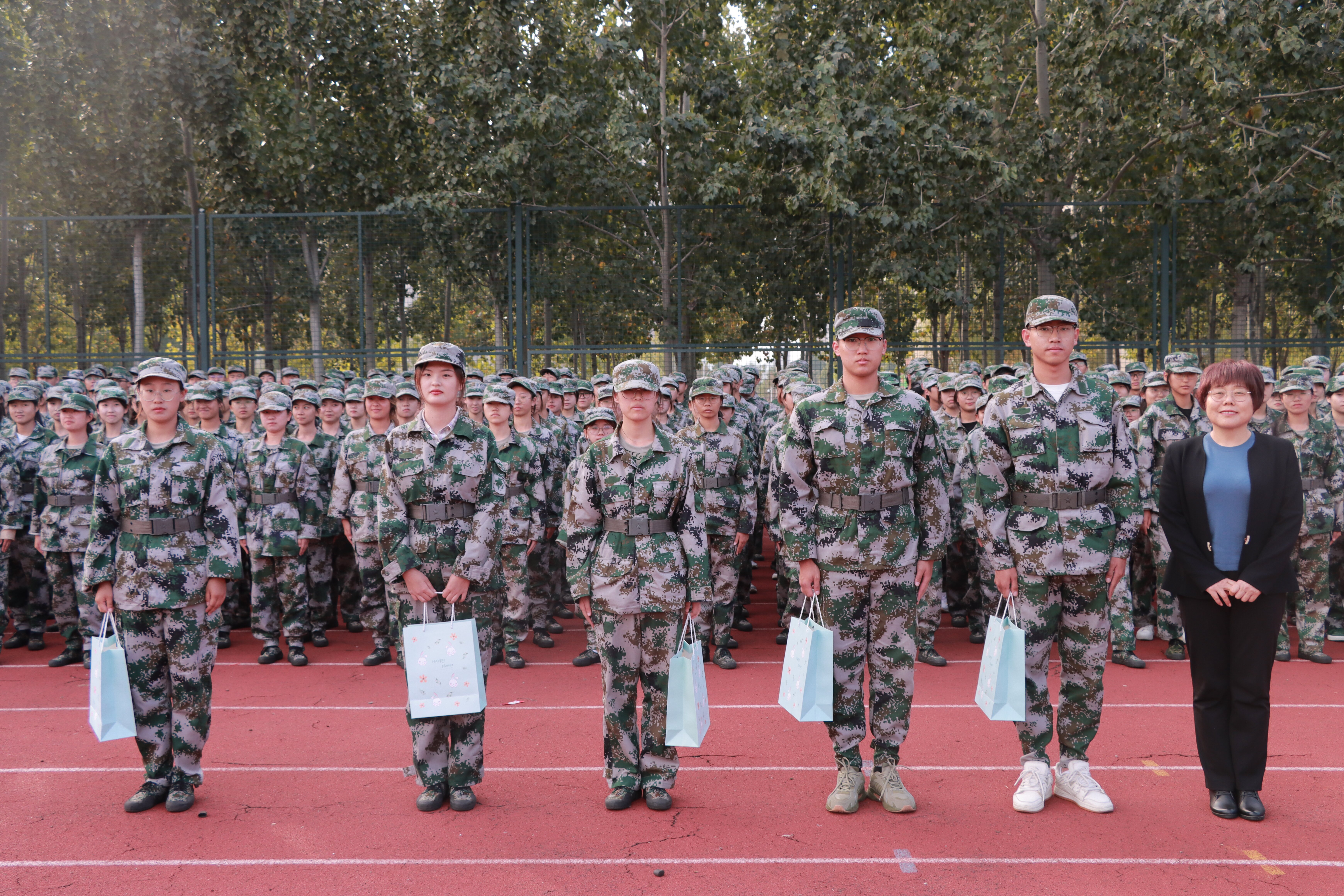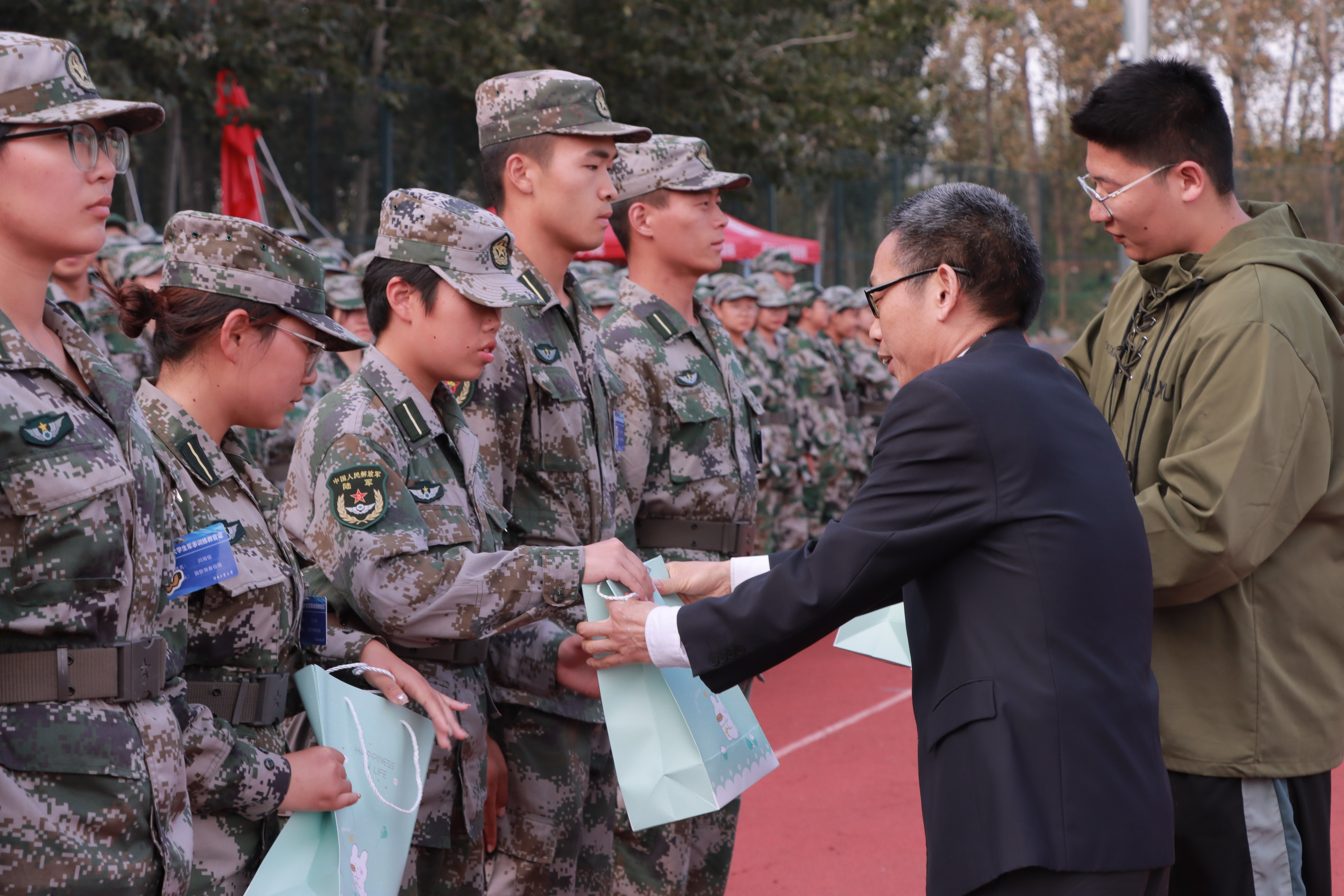 领导为教官及学生代表发放慰问品,希望同学们在接下来的军训中坚决服从教官指挥,不折不扣完成军训任务,并嘱咐学生会主席团成员为每位同学发放慰问礼物,给予在训同学们关怀与慰问。同学们欢呼鼓掌,气氛热烈。