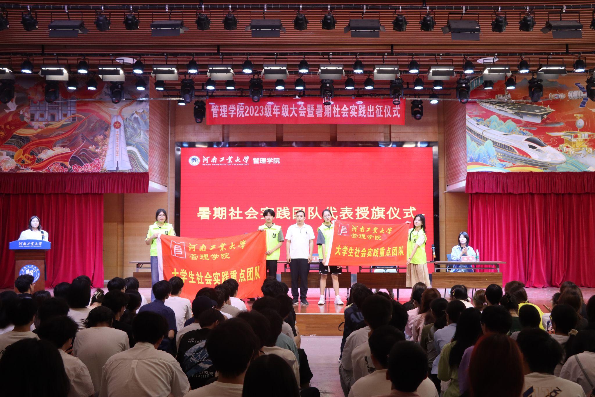 2024年暑期社会实践推进情况,同时强调要增强团队成员自身安全意识,在确保安全的前提下有序开展实践活动。随后,李国仓为暑期社会实践团队代表进行授旗并合影留念。