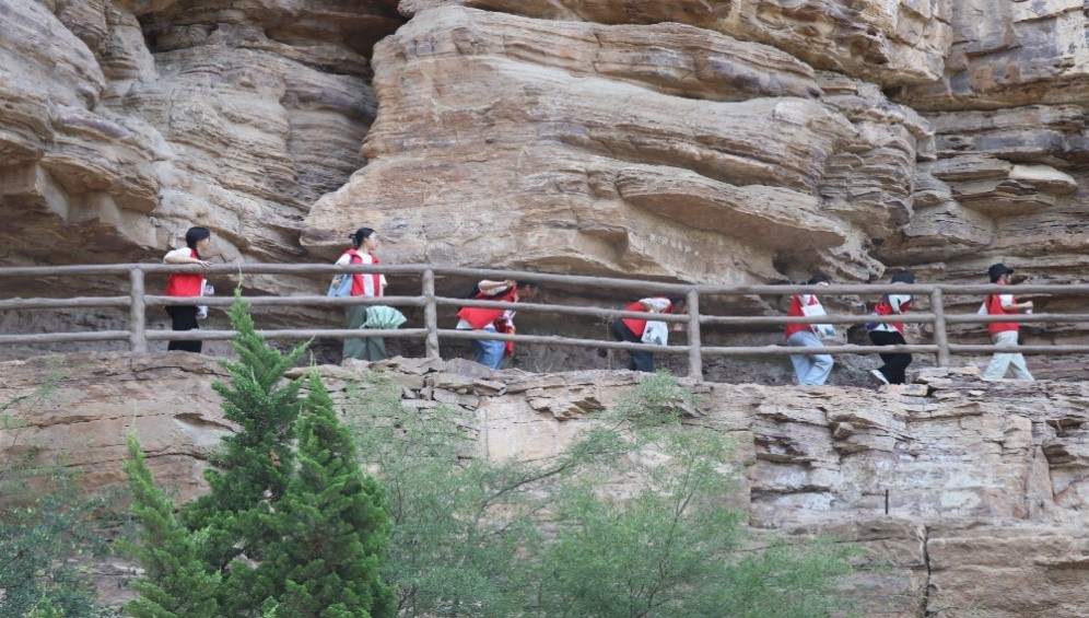 29日下午,各成员坐车前往红旗渠青年洞。青年洞因参加凿洞的突击队是从全县民工中抽调出来的300名优秀青年而得名。红旗渠要从陡峭如切的狼牙山悬崖绝壁上穿过,必须凿通一条长达600多米的隧洞。青年洞是红旗渠总干渠主要工程之一,坚硬如钢的石英砂石,一锤下去,只能留下一个斑点。正是在这种如同愚公移山般的精神支撑下,民工们仅仅用了一年多的时间就将山洞凿通。各成员到达山顶后,在保证安全的情况下,走过连接两座山头的攀崖悬壁“凌空栈道”,可体现艰苦创业的雄心壮志。行至胆战心惊“铁索桥”,可凌空倚云,飘若天仙。爬山至天下一绝“一线天”有胜黄山,峨媚之誉。成员们用一步步丈量红旗渠的土地,亲身体验红旗渠精神之宏伟、决心之坚定。