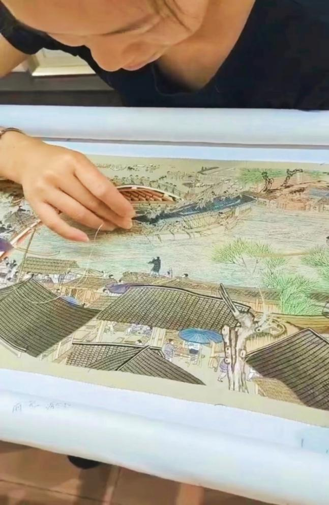 整个实践活动最令人感受颇深的就是成员们观摩绣工们缝制《清明上河图》的部分过程,以及绘画和装裱工人的工作,亲身体验了汴绣制作的精细与复杂。此外,小队还参观了博物馆为当地小朋友准备的汴绣体验室,并了解到其设立初衷也是让更多年轻人了解汴绣,认识汴绣,进而传承汴绣。