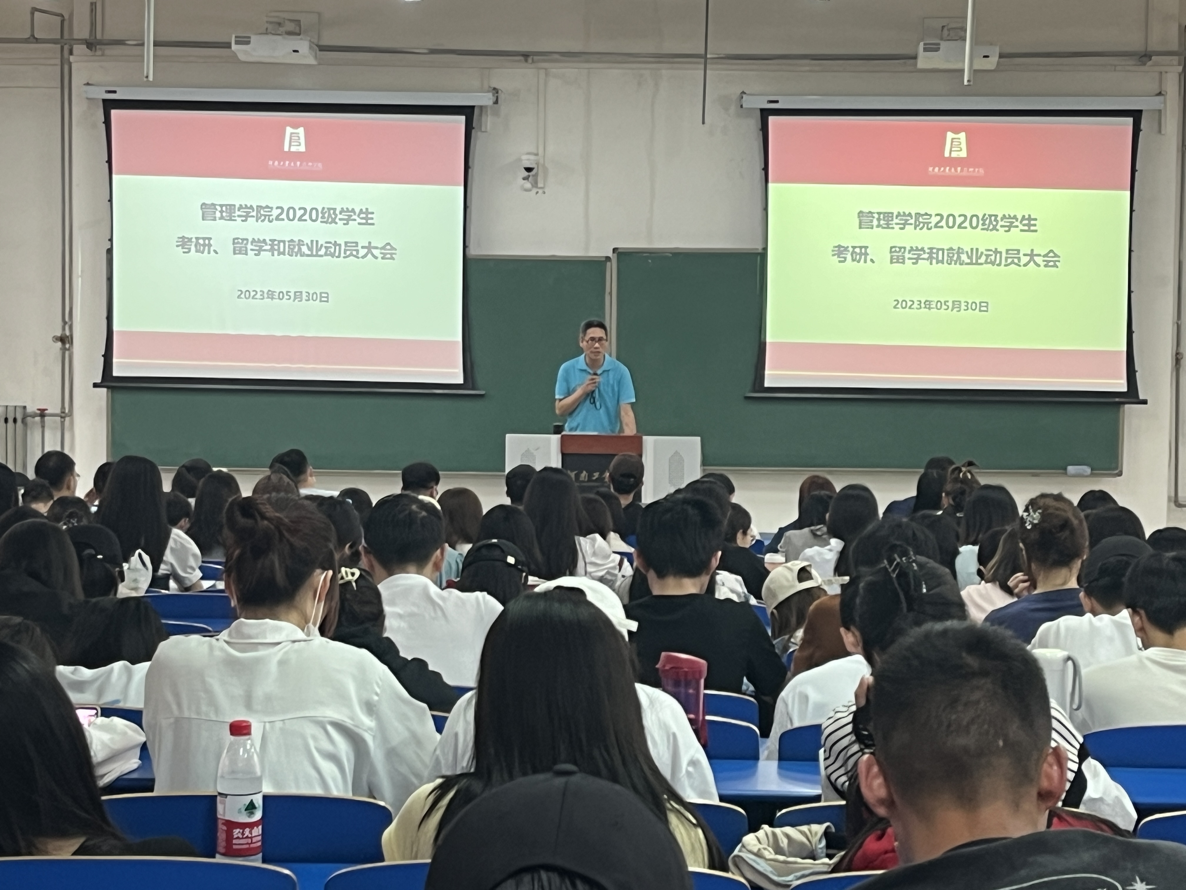 5月30日下午,捷报足球比分 在3101和3135教室举行2020级学生考研、留学和就业再动员大会,捷报足球比分 党委副书记魏涛、副院长李凤廷,国际教育捷报足球比分 项目办主任王优优、英路留学.咨询部经理甄舆到现场做动员交流。