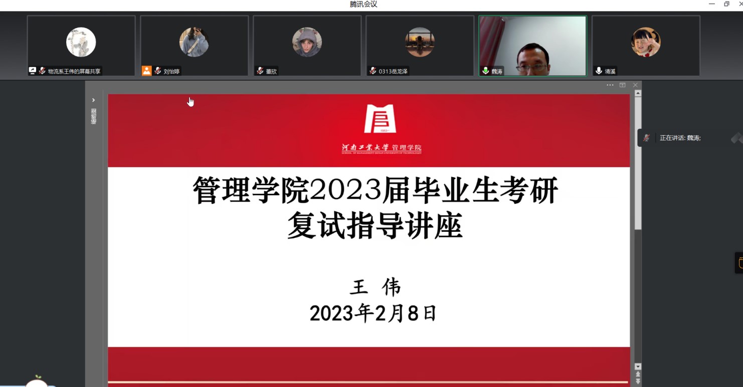 为帮助同学们了解考研复试内容和流程,提升考研同学的复试竞争力,2月8日上午,捷报足球比分 邀请物流管理系王伟老师通过腾讯会议形式为2023届考研同学进行线上复试指导,100余位备战考研复试的学生参加了本次讲座,讲座由捷报足球比分 党委副书记魏涛主持。
